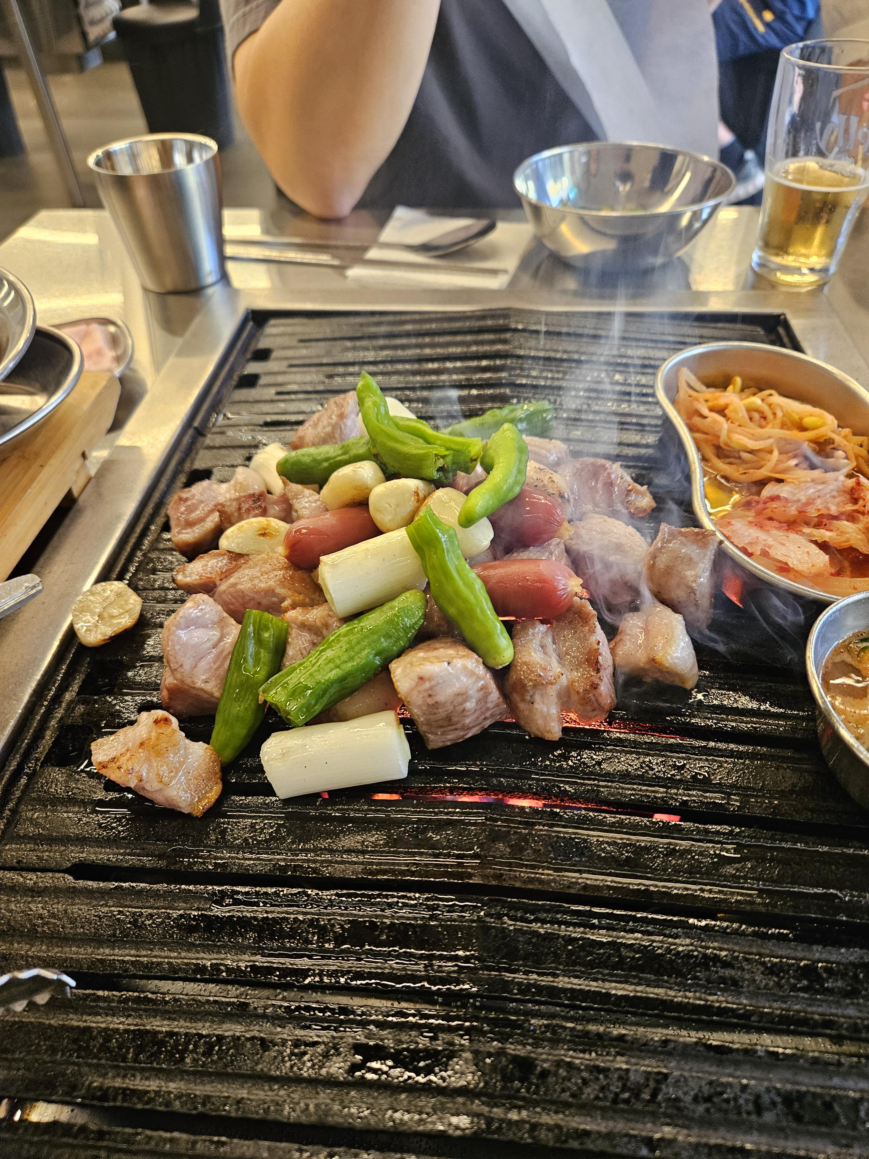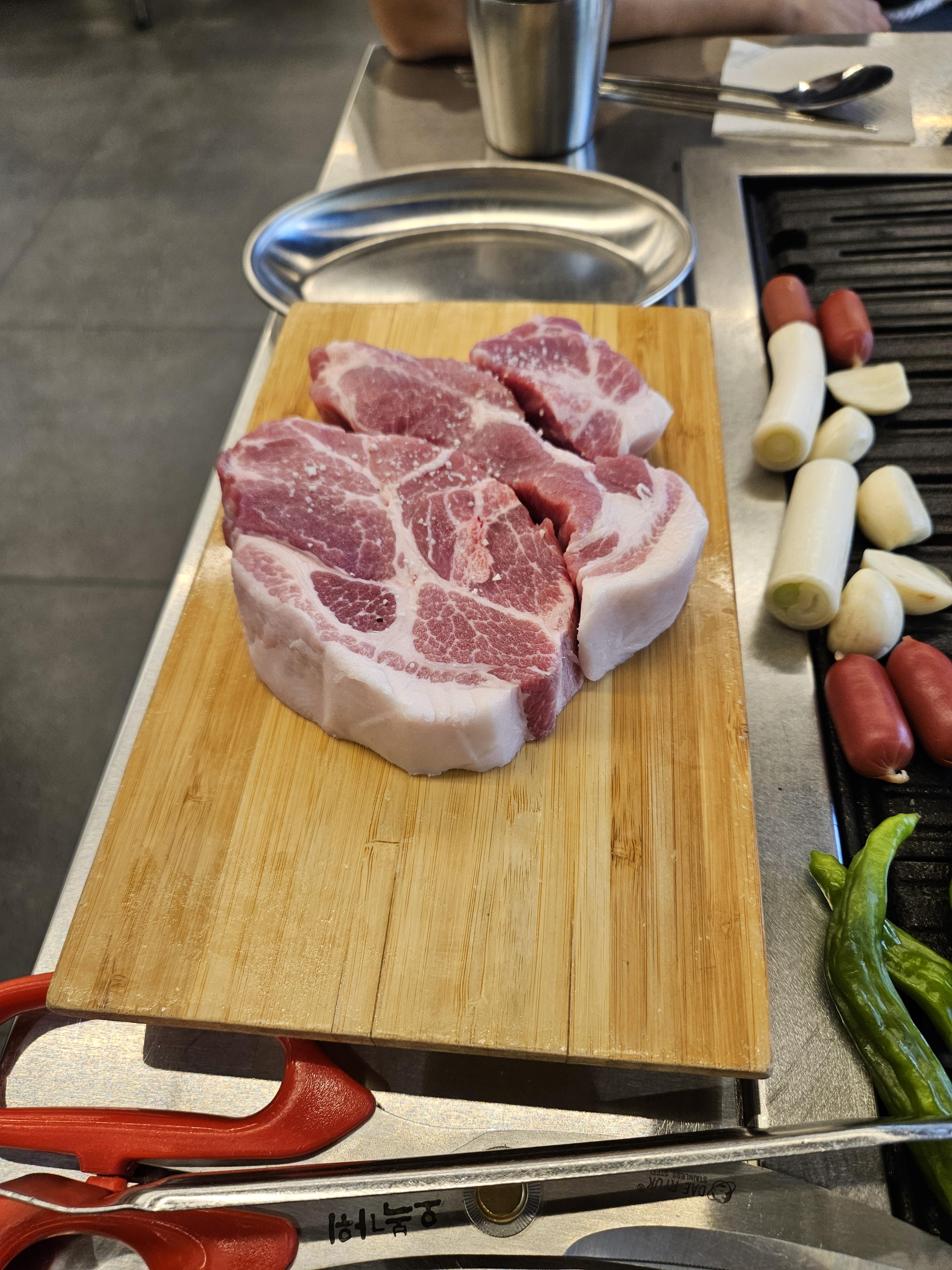 목살을 본격적으로 올려서 구워주시기 시작했습니다. 목살이 통목살이여서 두께가 두꺼워서 목살의 맛을 그대로 느낄 수 있는 두께였습니다. 고기가 다 구워질 때 직원분께서 대파와 꽈리고추, 비엔나소시지까지 같이 구워주셨습니다. 야채와 다 같이 구워서 사진도 찍게 해 주셔서 직원분의 센스가 너무 좋았습니다.