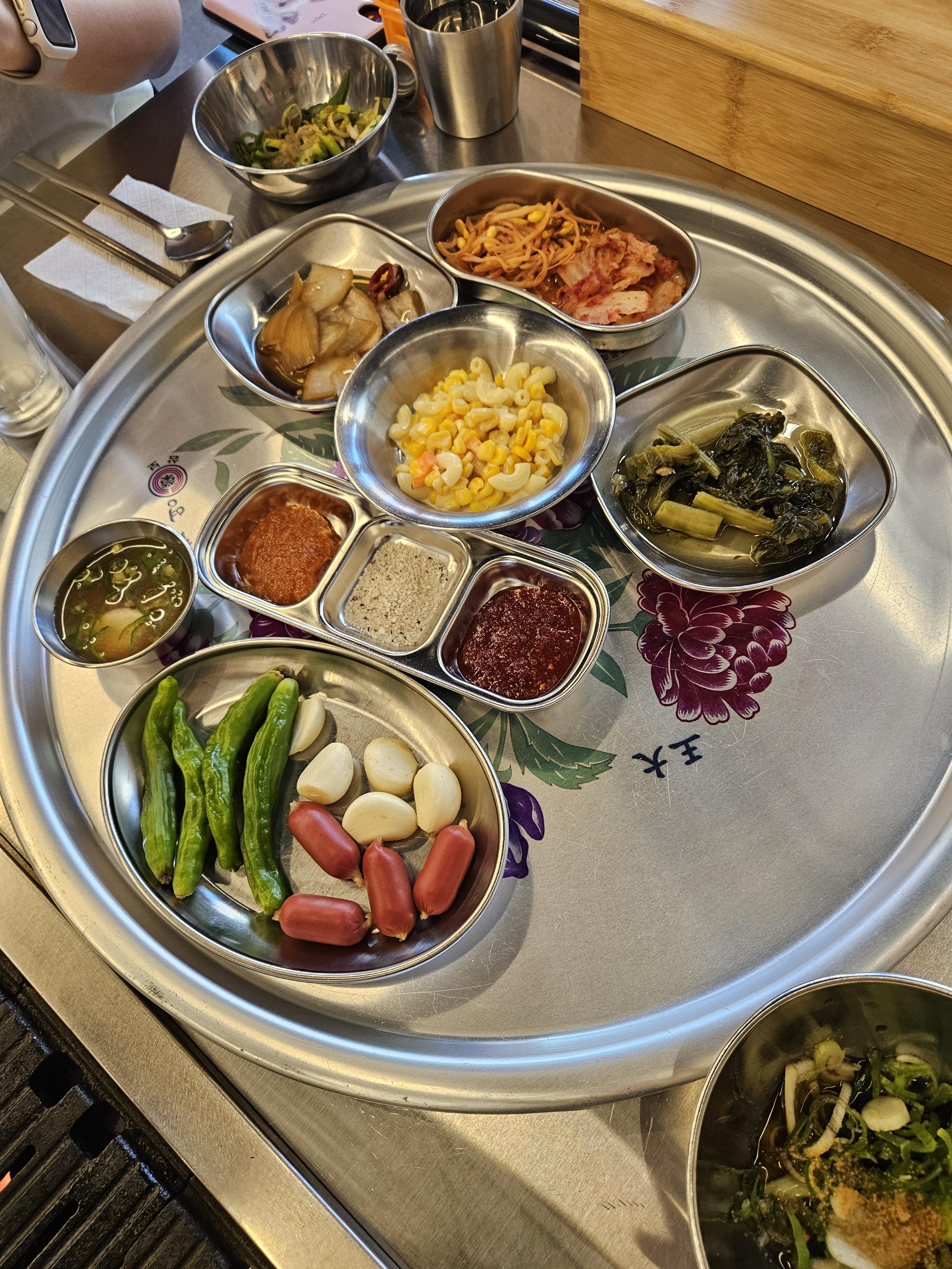 기본반찬은 저렇게 간소하게 나와있습니다. 쌈채소가 없어서 많이 아쉬웠는데 셀프코너에 상추와 고추등 쌈채소는 물론이고 기본반찬도 더 있어서 추가로 언제든지 가져다 먹을 수 있어서 좋았습니다.